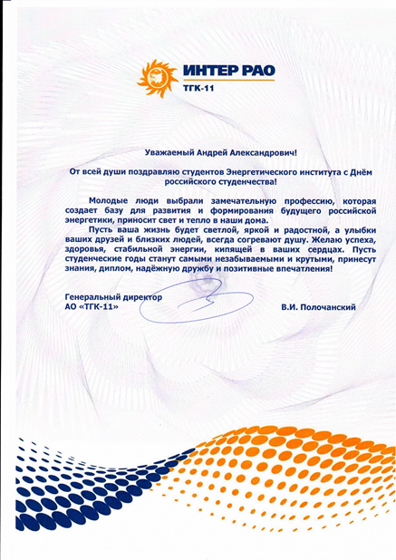 Компания ИНТЕР РАО "ТГК-11" поздравляет студентов и желает творческих успехов, новых свершений и побед.
