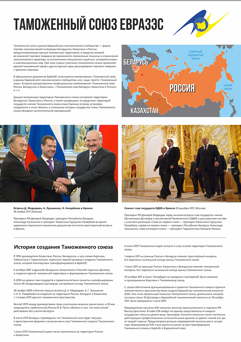 Договор о создании ЕАЭС был подписан в Астане 29 мая 2014 года. Сейчас государствами - участниками ЕАЭС являются Республика Армения, Республика Беларусь, Республика Казахстан, Киргизская Республика и Российская Федерация. В ЕАЭС обеспечивается свобода движения товаров, услуг, капиталов и рабочей силы, также предполагается проведение скоординированной экономической политики.
