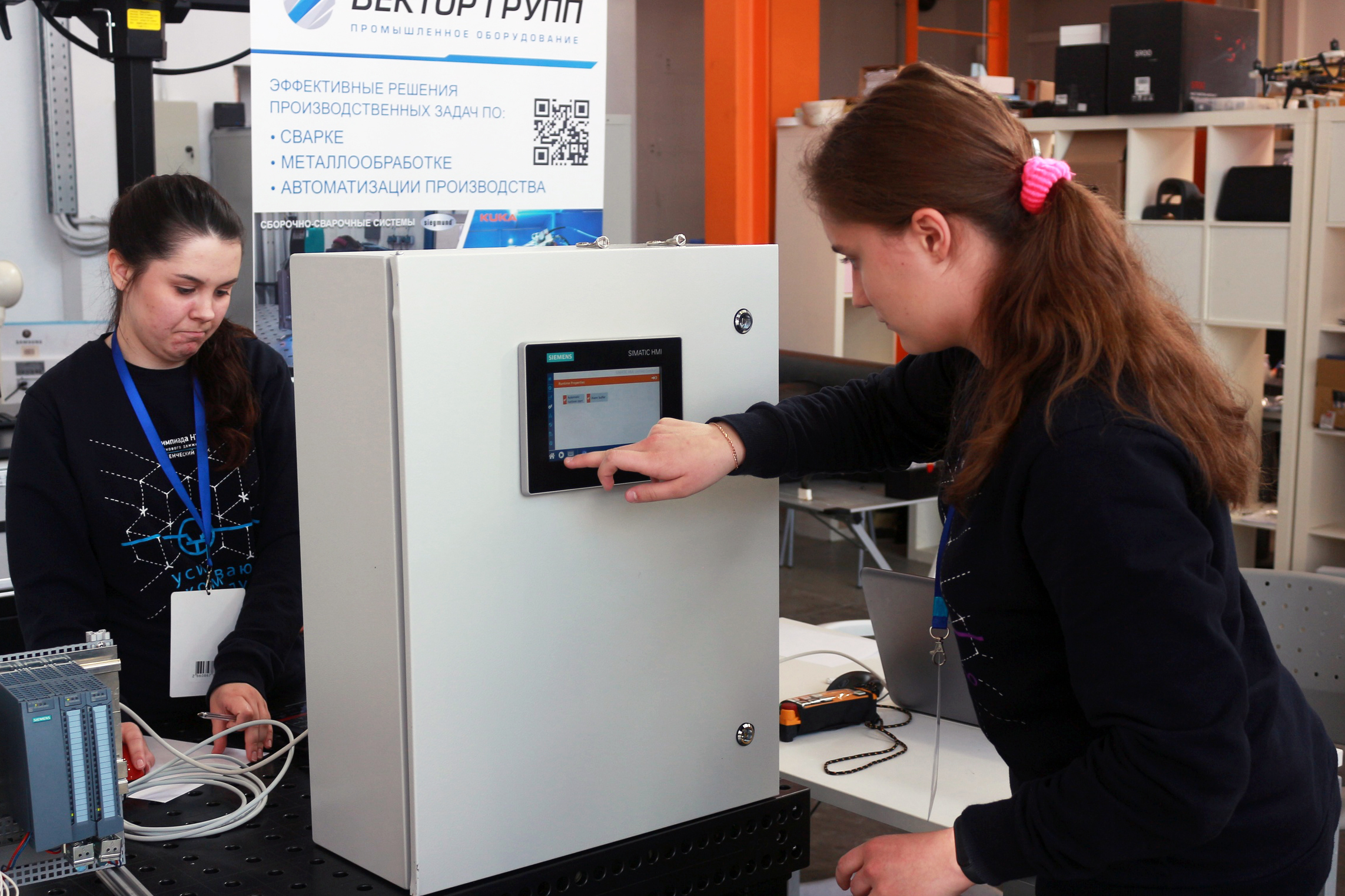 В конце испытания на работу с настоящим оборудованием у конкурсантов было выделено 45 минут, за последние 5 минут им было необходимо продемонстрировать качество работы цифрового двойника на реальном роботизированном оборудовании. Комплекс состоял из двух промышленных роботов KUKA, 4 систем подачи заготовок, конвейера, промышленного контроллера и HMI панели Siemens.